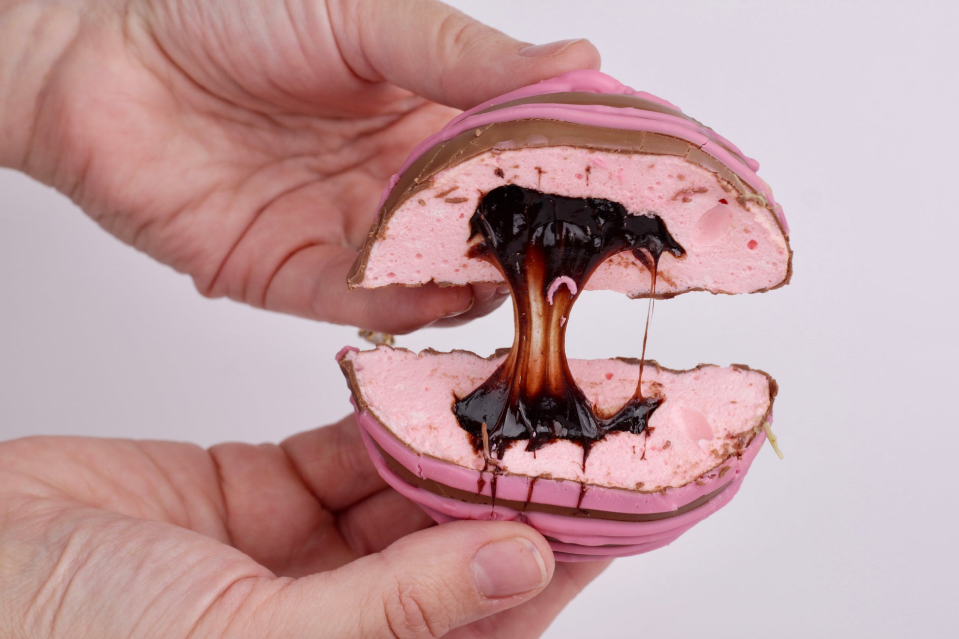 Our Choc Strawberry Marshmallow Dome is what happens when fluffy strawberry marshmallow, gooey chocolate fudge sauce, and creamy milk chocolate all decide to have a party. Each dome is drenched in silky milk chocolate and finished with a playful strawberry truffle drizzle for maximum yum.